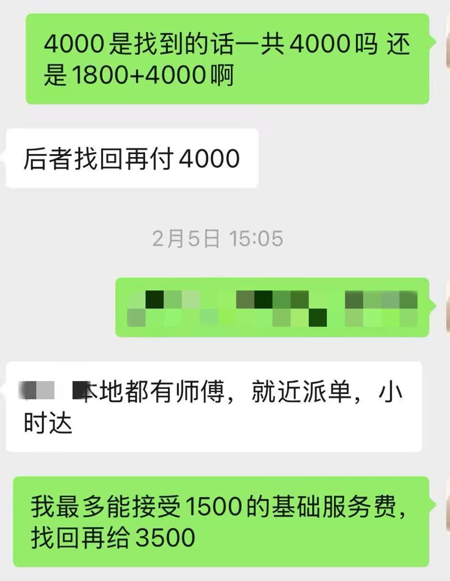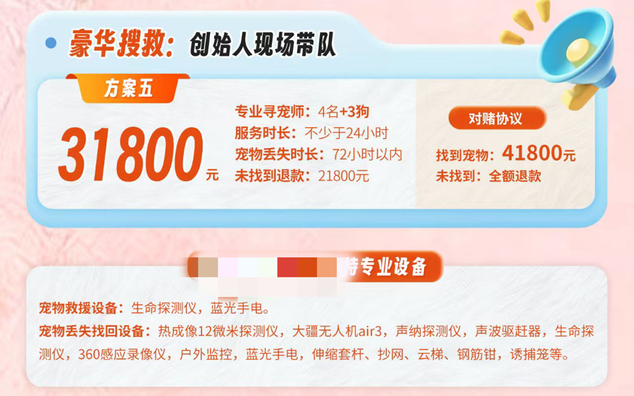 为进一步了解情况,记者假扮失宠东谈主士,就地打听了10个寻宠团队。靠近记者给出疏导的丢宠景色,10个寻宠团队的报价从3000元到5500元不等,有一个团队以至推选价值31800元的“豪华搜救”决议。然则,当被问及订价尺度与依据时,通盘团队均以“按照以往订价”作答,回应颇为迂缓。