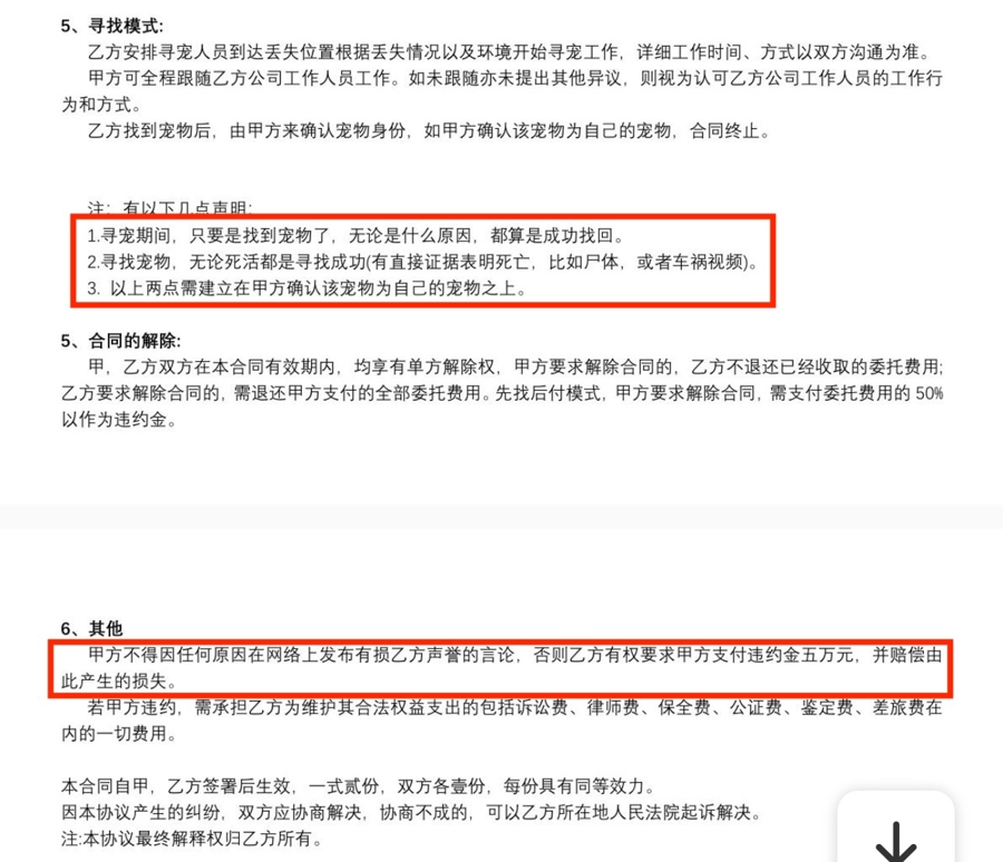 据豆豆回忆,她在签约合同期就多项不自制条件提议质疑,但寻宠团队并未作念太多转念,仅仅催促豆豆尽快签约,便于尽早寻狗。