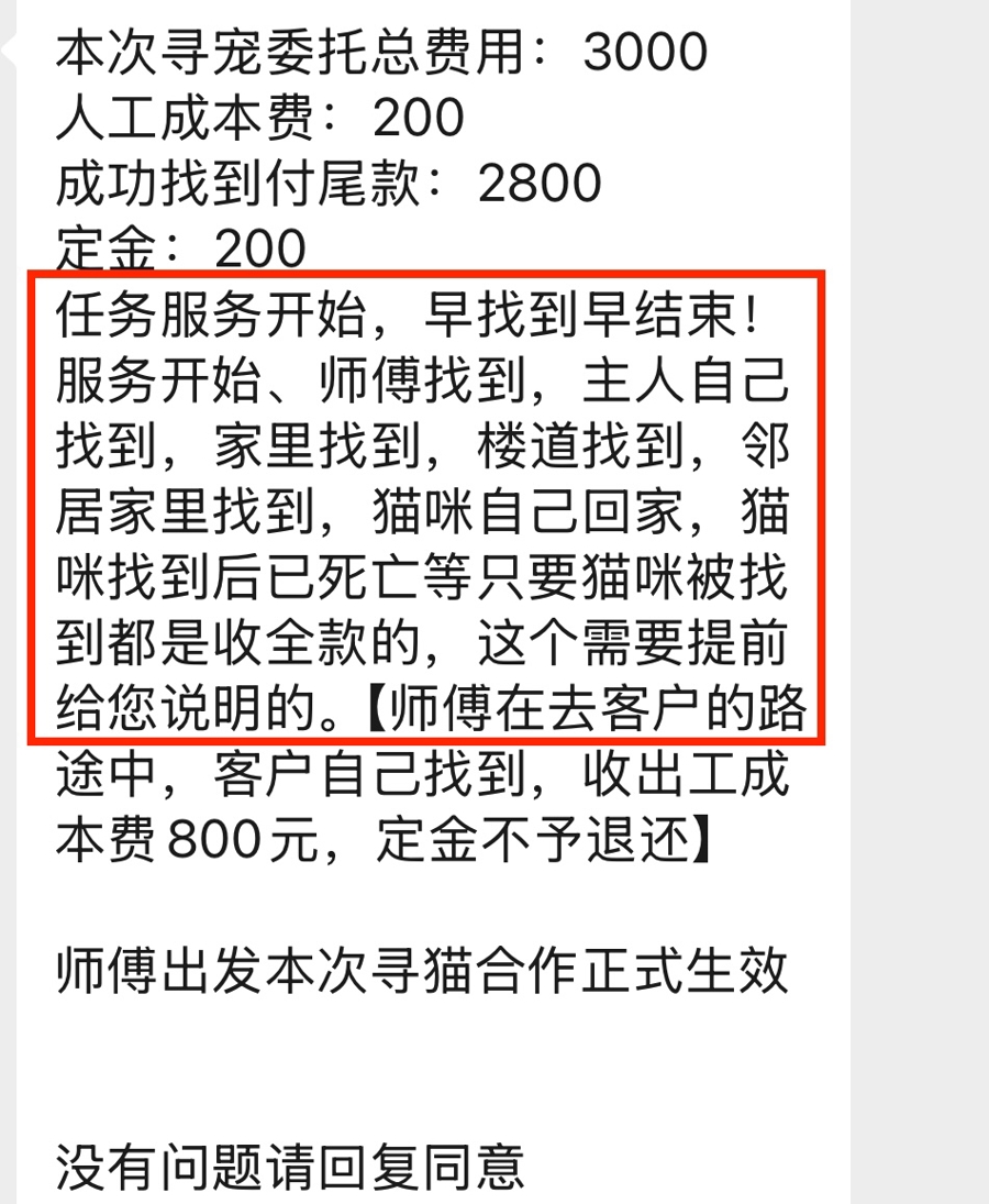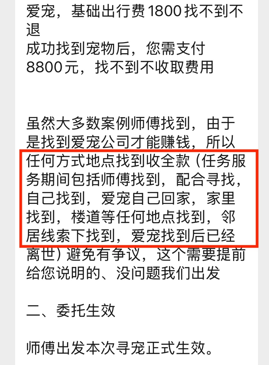 记者发现,许多寻宠团队皆在合同中荒谬皮明“找回收费”,将其界说涵盖险些通盘可能的后果:无论宠物是由团队找到、调和找回、主东谈主自行找到、我方回家、师父赶赴途中被找到、在职何场地被发现,还是找到时已离世,均视为“已找回”,失主需支付全款。若寻宠团队未能按照商定勤勉搜寻、参加东谈主力物力,宠物找回后果与其管事并无径直关联,那么此类条件无疑组成对失主不利的连续。