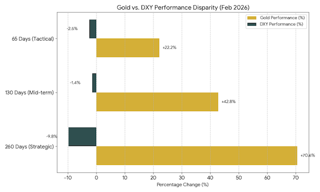 根据BCA Research的计算方法,在一个完整的年度交易周期内,美元指数从107.96回落至97.42,跌幅仅为9.76%;而同期金价却从每盎司2875美元飙升至2月3日的4905美元,涨幅超过70%。若以半年为观察窗口,这一背离更为显著,美元指数微跌1.38%,金价却暴涨42.84%,两者变动倍数比达到31倍。