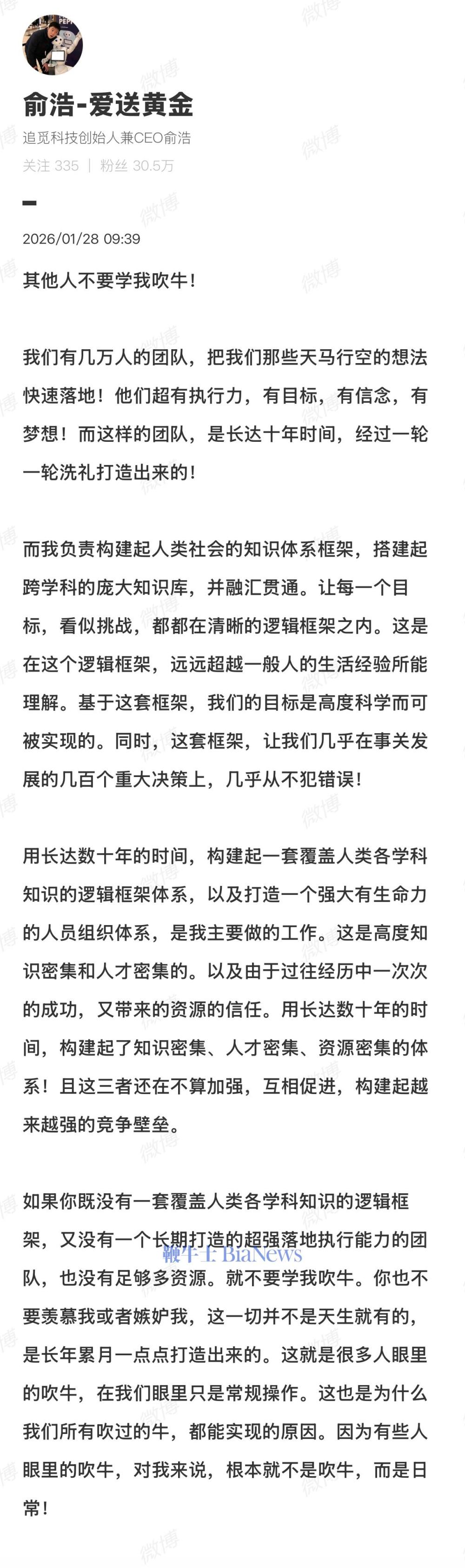易云达配资1月28日,追觅科技创始人兼CEO俞浩发布微博,开篇直言“其他人不要学我吹牛”,股票配资风控随后阐述其“吹牛”的底气。