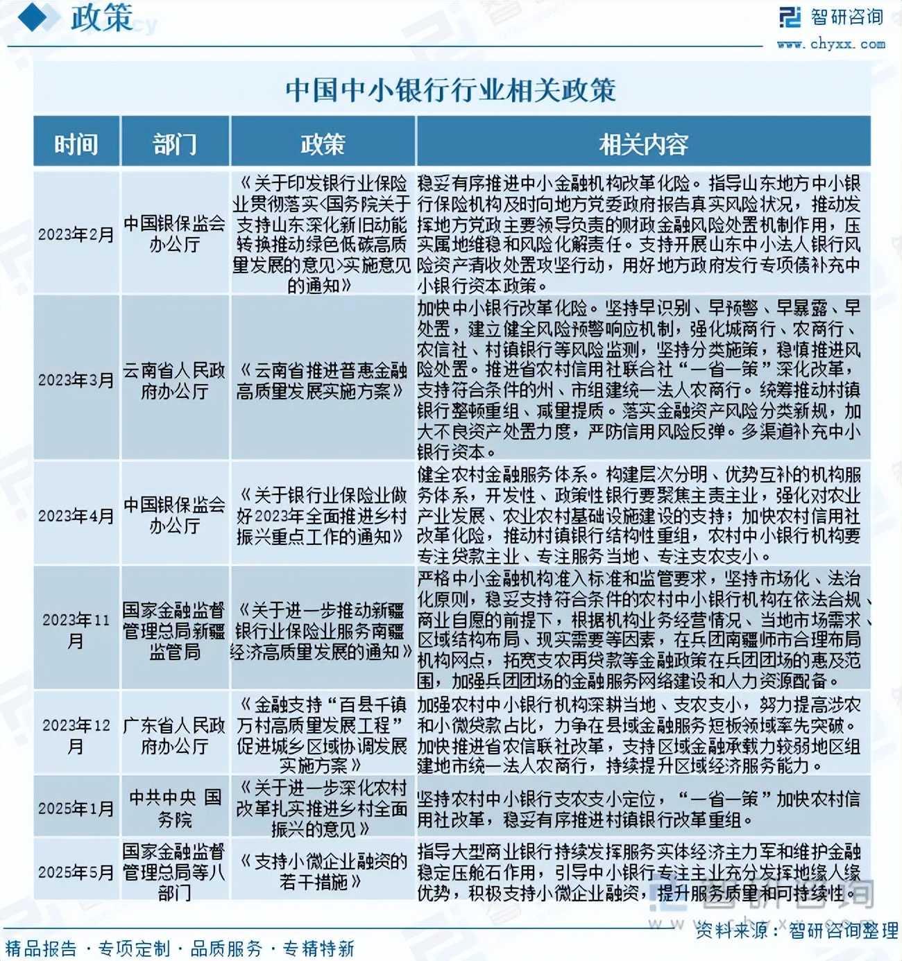 10大配资公司为保障国内金融经济健康高质量发展,国家对于我国中小银行业发展给予了极高关注度,行业政策发展环境不断优化,持续利好产业发展。例如,2025年1月,盛达优配中共中央 国务院印发《关于进一步深化农村改革扎实推进乡村全面振兴的意见》,坚持农村中小银行支农支小定位,“一省一策”加快农村信用社改革,稳妥有序推进村镇银行改革重组。2025年5月,国家金融监督管理总局等八部门印发《支持小微企业融资的若干措施》,指导大型商业银行持续发挥服务实体经济主力军和维护金融稳定压舱石作用,引导中小银行专注主业充分发挥地缘人缘优势,积极支持小微企业融资,提升服务质量和可持续性。