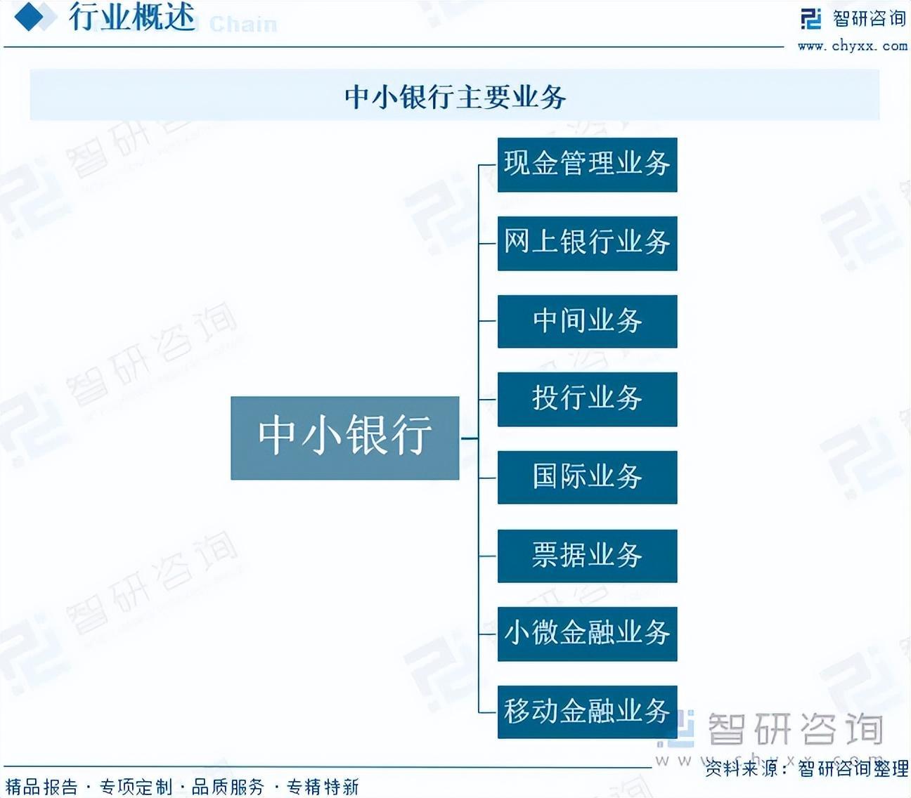中小银行主要业务包括现金管理业务、网上银行业务、中间业务、投行业务、国际业务、票据业务、小微金融业务和移动金融业务。