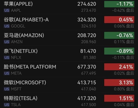 大型科技股多数高潮,微软涨超3%,英伟达、脸书涨超2%,特斯拉涨逾1%,谷歌涨0.45%;苹果跌超1%,亚马逊跌0.76%。