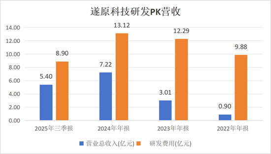 具体而言:2022年营收0.9亿元,研发投入9.88亿元;2023年营收3亿元,研发投入12.3亿元;2024年营收7.22亿元,研发投入13.12亿元;2025年前三季度营收5.4亿元,研发投入8.9亿元。