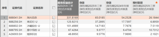 截至2025年第三季度,摩尔线程预付款项为10.73亿元;海光信息为26.18亿元;沐曦股份为7.51亿元;寒武纪为6.90亿元;燧原科技则为2.10亿元。