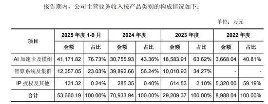 2022年至2025年前三季度(报告期内),该业务营收分别为0.37亿元、1.86亿元、3.08亿元、4.12亿元,占燧原科技营收比重从40%一路升至近77%。同期,智算系统及集群收入分别为:0元、1.00亿元、3.99亿元、1.24亿元,占比在23%至56%之间波动。