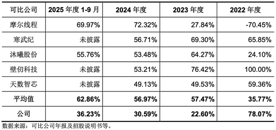 同期,同行可比公司毛利率平均值分别为35.77%、57.47%、56.97%及62.86%。其中寒武纪、摩尔线程等企业在2024年后的毛利率普遍维持在50%至70%的区间,壁仞科技在2022年甚至实现100%的毛利率。
